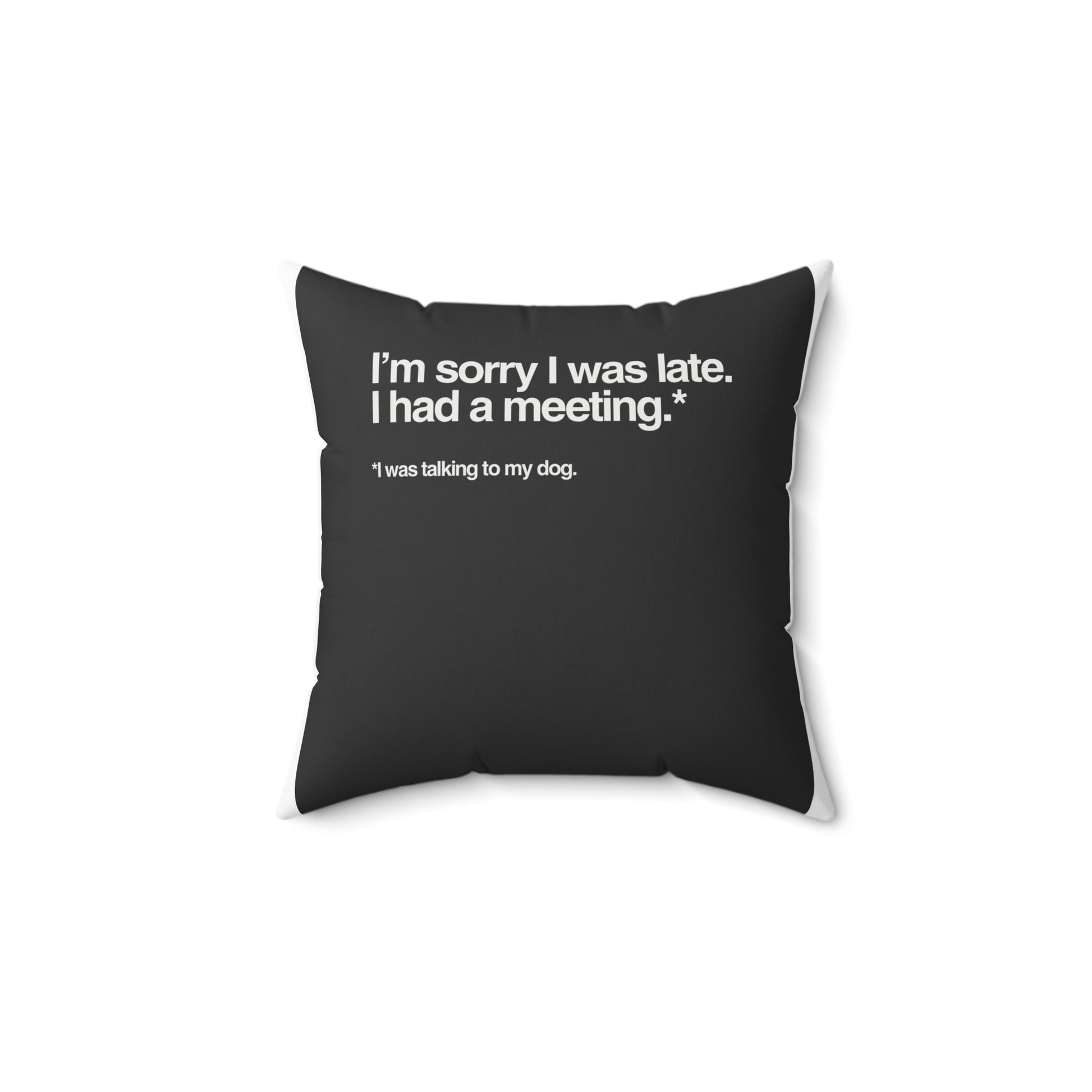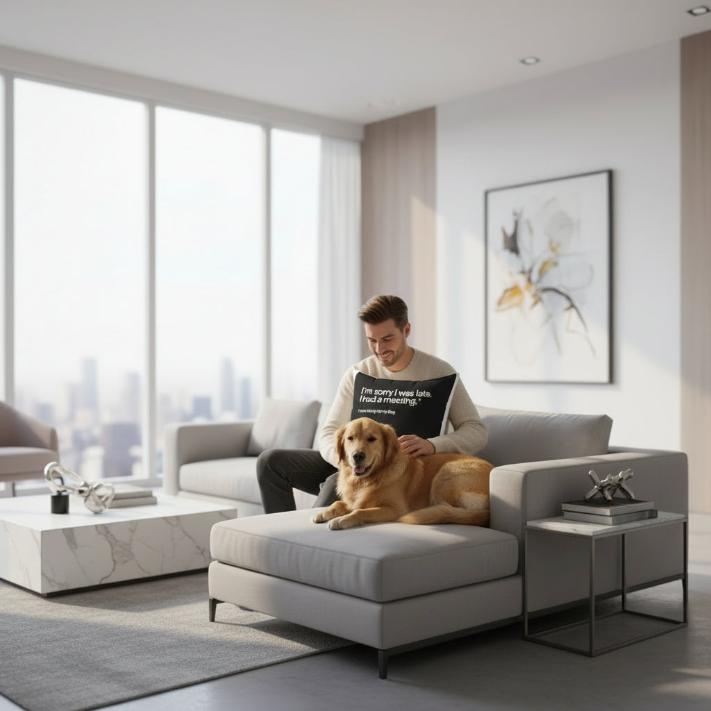A witty cushion for dog lovers who've mastered the art of prioritizing their pup. Featuring bold white text on matte black, it reads "I'm sorry I was late. I had a meeting" with the punchline "I was talking to my dog." Double-sided print and concealed zipper ensure clean lines and visibility from every angle. Perfect for living rooms, home offices, or anywhere you need a knowing smile.